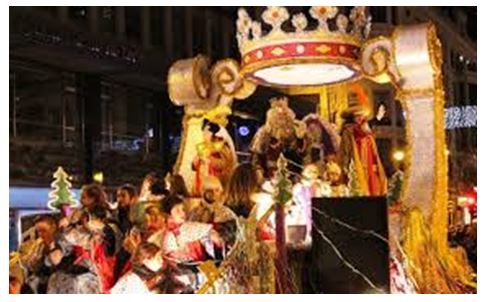 El dia de Reyes, durante toda la tarde de 5 de enero, en cada ciudad salen a desfilar las grandes carrozas de las cabalgatas en las que, además de músicos o gente disfrazada, están los Tres Reyes Magos saludando a todos los niños de la ciudad.