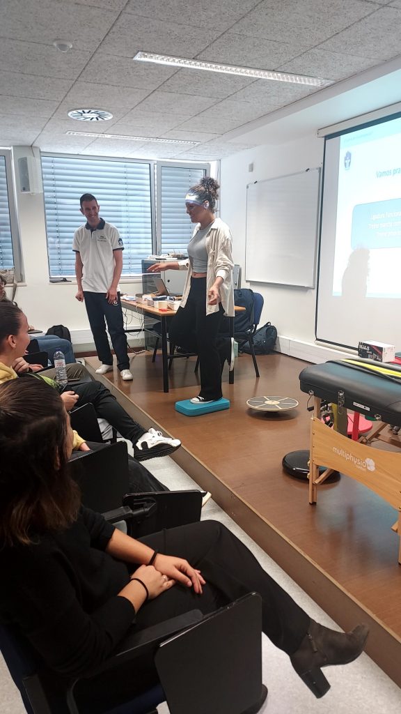 Além da vertente teórica, onde foram explicadas as principais áreas de intervenção do Fisioterapeuta — como a Pediatria, Saúde da Mulher, Músculo-esquelética, Neurologia, Reabilitação Cardíaca e Respiratória, e Envelhecimento Ativo — a palestra destacou-se pela forte componente prática, tornando a experiência particularmente dinâmica e interativa.